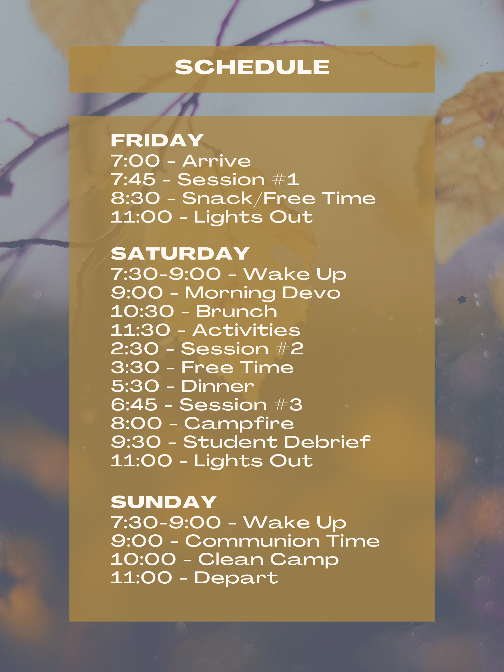 Our church is going on a Retreat this Fall, and we want you to join! Bring your kids, invite your friends, we've got plenty of space. Come and join us for a relaxed weekend with family friendly games, teen activities, and thoughtful theme that helps direct our focus towards Jesus.
